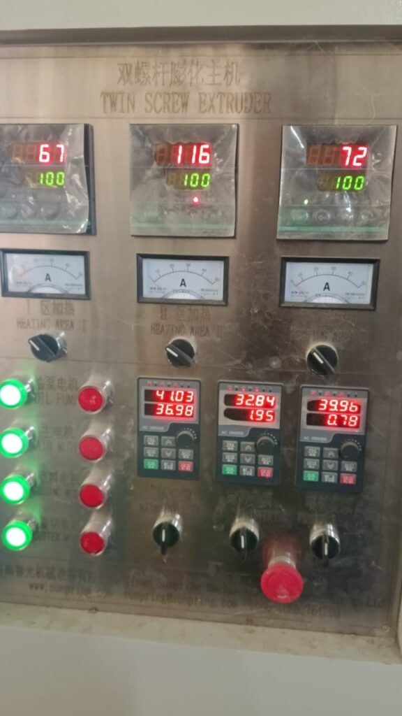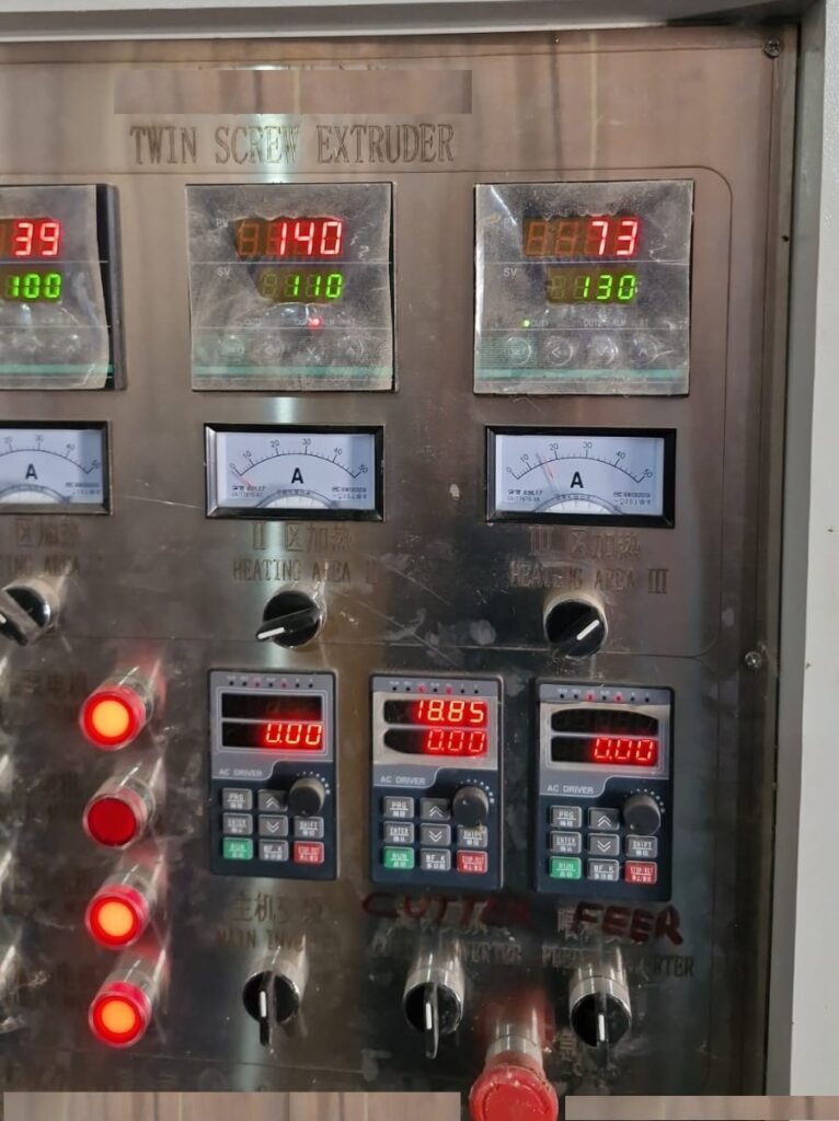 Once moisture was optimized, we adjusted parameters using the VFD (Variable Frequency Drive) and control panel of the twin-screw extruder.